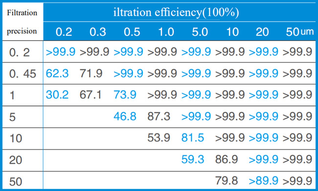 Filtration efficiency table